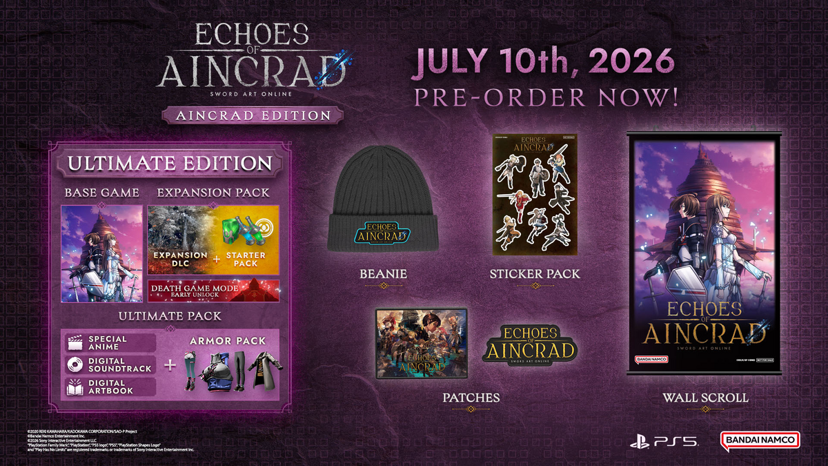 Sword Art Online: Echoes of Aincrad já está disponível para pré-venda em todas plataformas suportadas, sendo elas: Playstation 5, Xbox Series X|S e Steam. O jogo também contém diversas edições diferentes como: Standard Edition, Deluxe Edition, Ultimate Edition e Aincrad Edition (essa última por sinal, você só consegue comprar na loja da própria Bandai e para Playstation 5). O jogo está previsto para estar disponível, sexta-feira, 10 de julho de 2026.